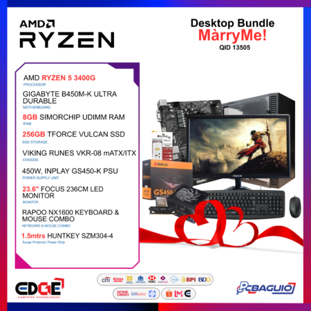 MÃ rryMe! | Ryzen 5 3400G | 8GB DDR4 RAM | 256GB SSD | 23.6″ FHD Monitor | Keyboard | Mouse | 3-Port Surge Protector (QID 13505)